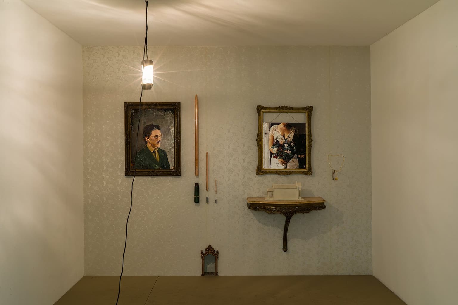 No fio cortante do canto do pássaro que preenche a instalação A materialização do canto da mãe da lua (2022), ecos dos percalços das ditaduras latino-americanas se apresentam em uma narrativa tanto particular como compartilhada. O rastro de luz baixa que recorta a instalação revela de maneira precária a composição material: separados por três calibres de balas usadas e seus respectivos trajetos, tornados matéria em cobre maciço, encontram-se dois retratos de médio formato. O primeiro, do lado esquerdo, representa um militar em pose austera; formado por uma massa de tinta que não aguenta o enquadramento barroco e escorre pelas bordas, desmanchando-se; o segundo, do lado direito, apresenta meio corpo de uma noiva, trajada em vestido de renda, que carrega um buquê floral ao centro de seu ventre. Ela tem sua face recortada pela parte superior do quadro, permitindo ver apenas o seu queixo. A tela se ajusta com notável dificuldade em uma moldura maior que o seu formato, e sua massa converge, no sentido da gravidade, para uma miniatura de uma igreja, um tanto quanto modesta, colocada logo abaixo sobre um aparador de parede. Uma igreja branca como a vestimenta da retratada. Mais à direita na parede, um colar dourado com um pingente redondo em seu centro. Abaixo, um pequeno oratório revela um bueiro do qual, engaiolado em seu fundo, um canto de urutau ecoa.